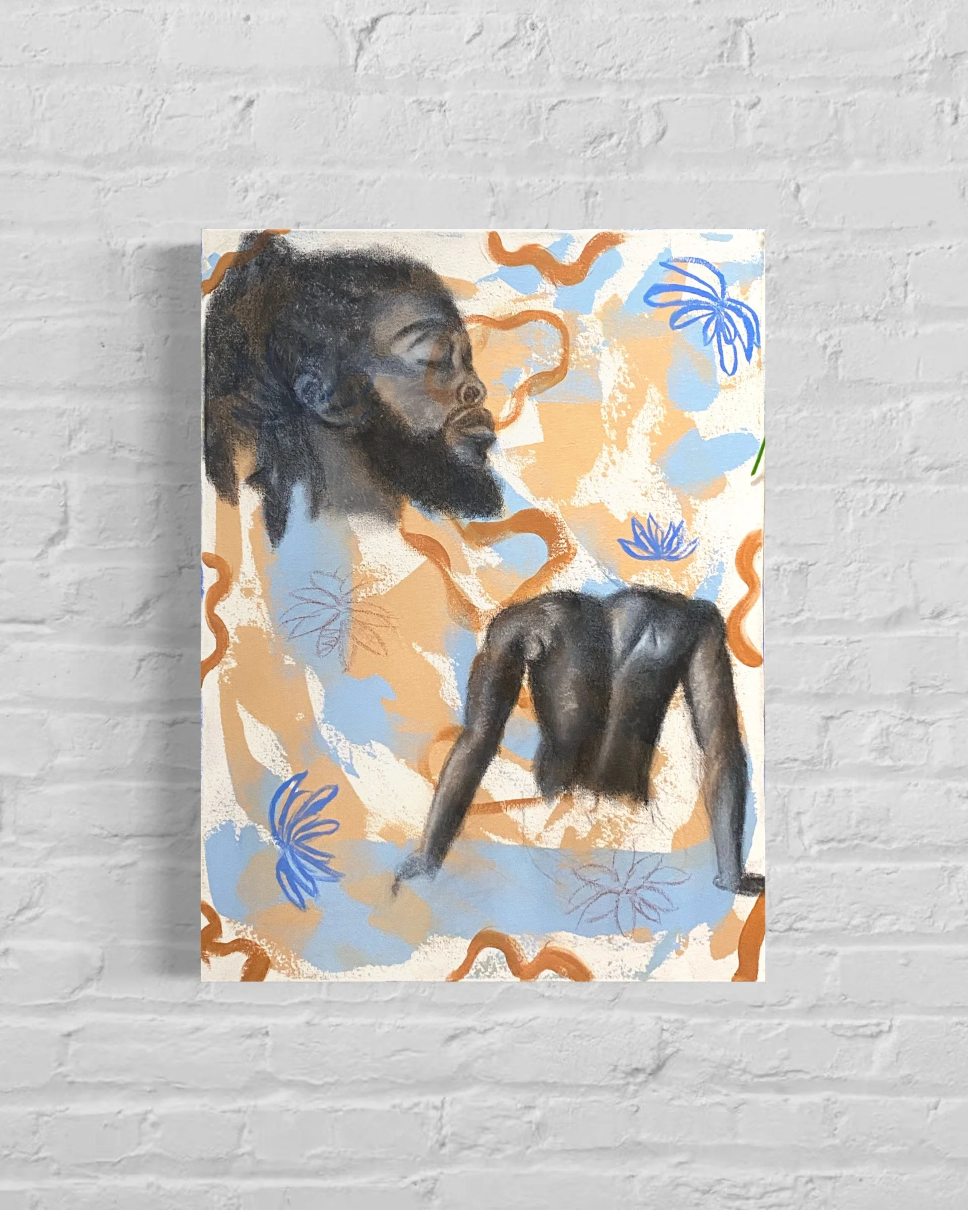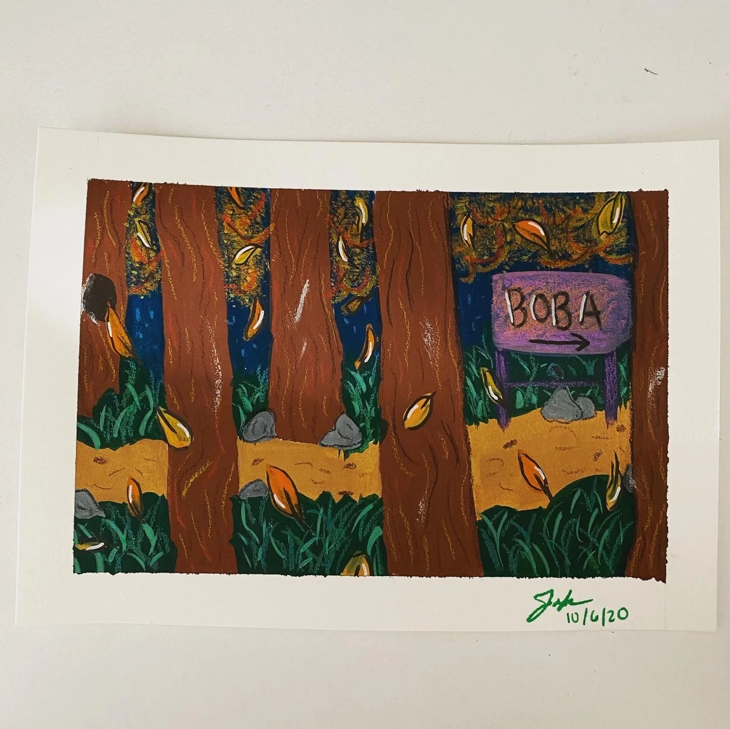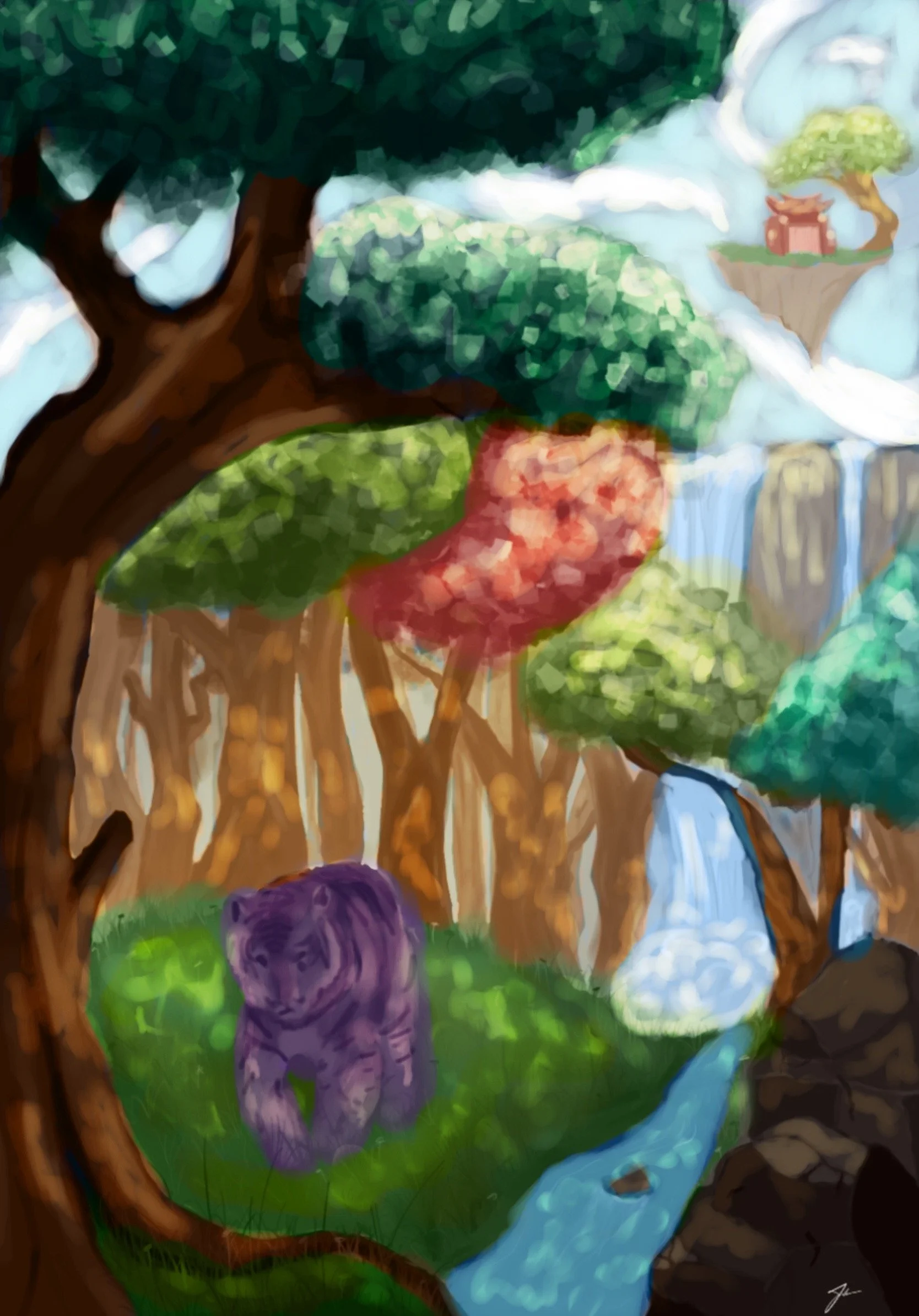 Abstract digital artwork featuring a large brown shape resembling a whale or creature, set against a swirling background with lines and shapes in shades of pink, brown, and purple.