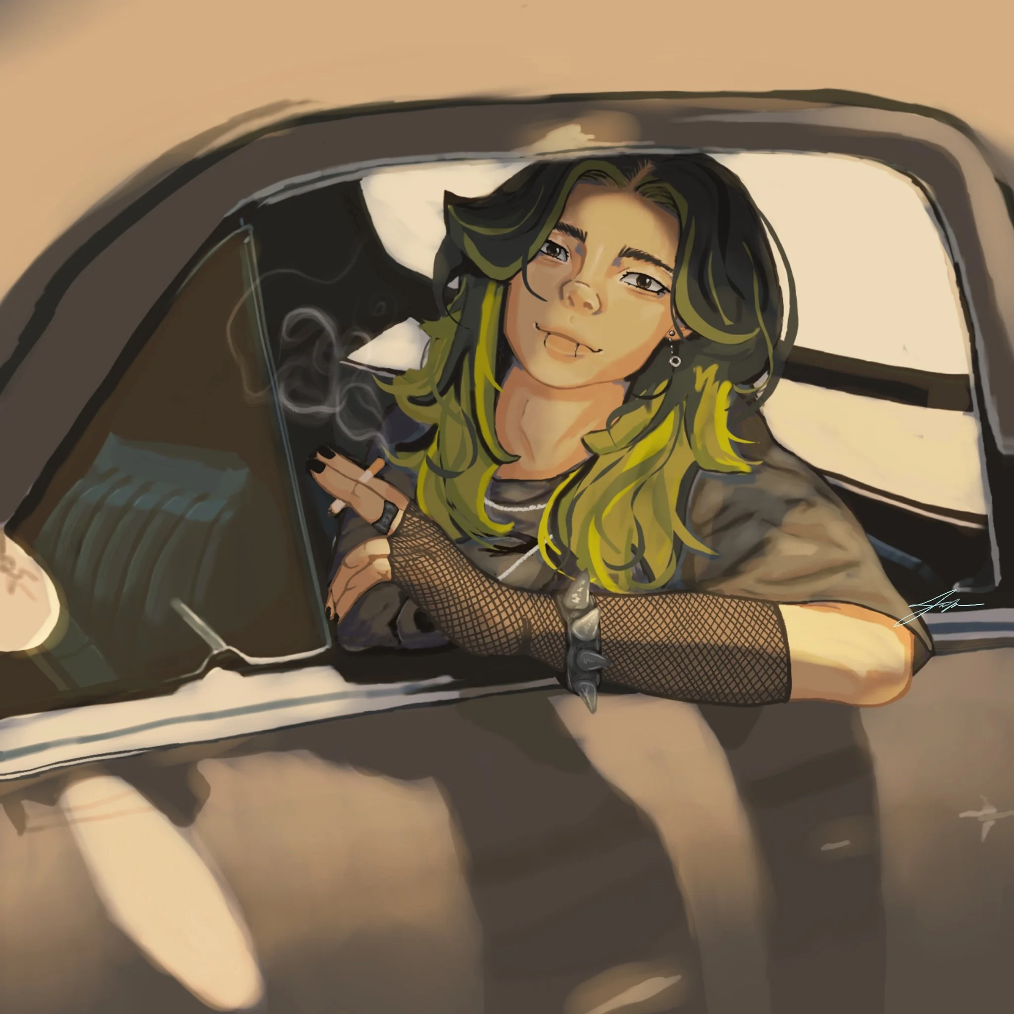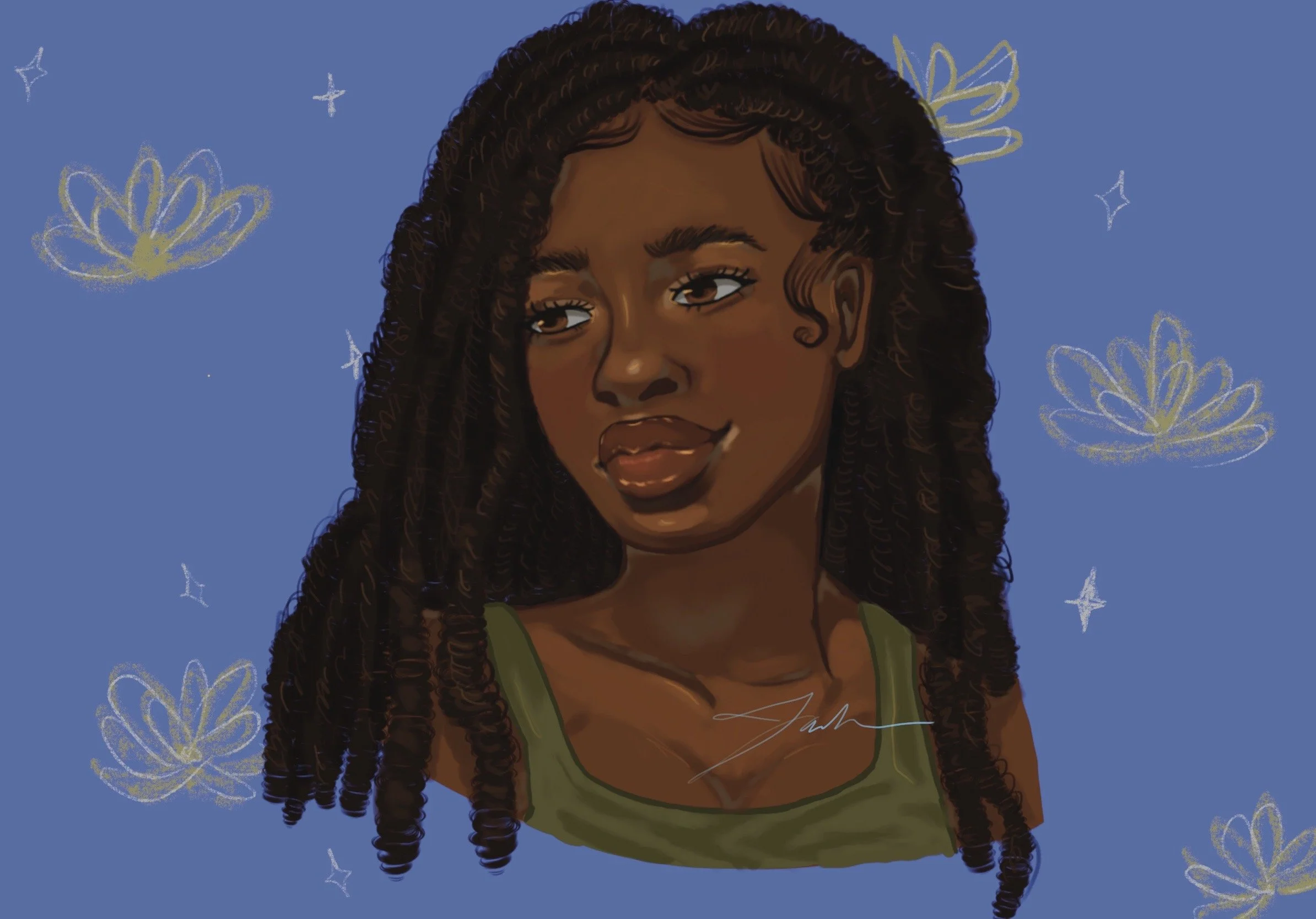 Digital portrait of a woman with curly hair, freckles, and a confident expression, wearing a collared shirt.
