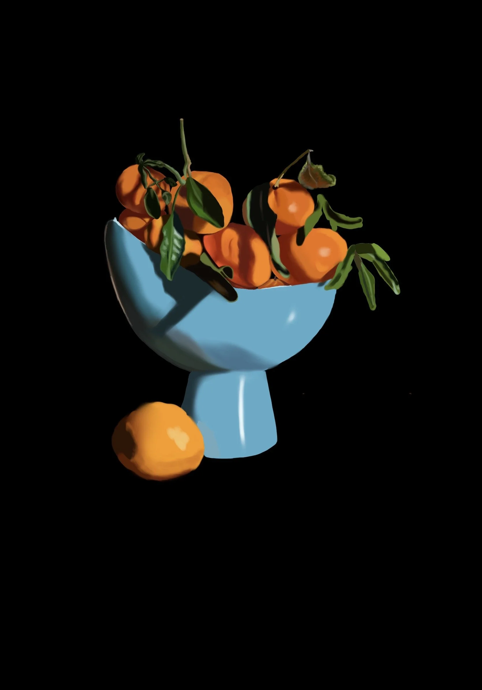 A blue ceramic goblet filled with oranges and green leaves, with one orange fruit placed on a black surface beside it.